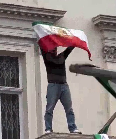 A protester climbed onto the balcony of the Iranian embassy in London on Saturday and pulled down the flag of the Islamic Republic. Footage shows the demonstrator holding up the Lion and Sun flag, Iran’s official national flag prior to the 1979 revolution.